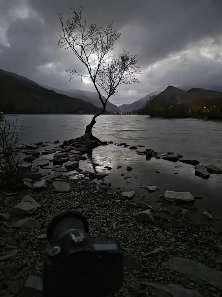 This was my first time at Llyn Padarn. The famous tree—a Solitary Birch planted in 2010—was supposed to be on a small peninsula. I walked around it in the dark, circling like a confused satellite. At one point I genuinely thought, Someone’s cut it down.