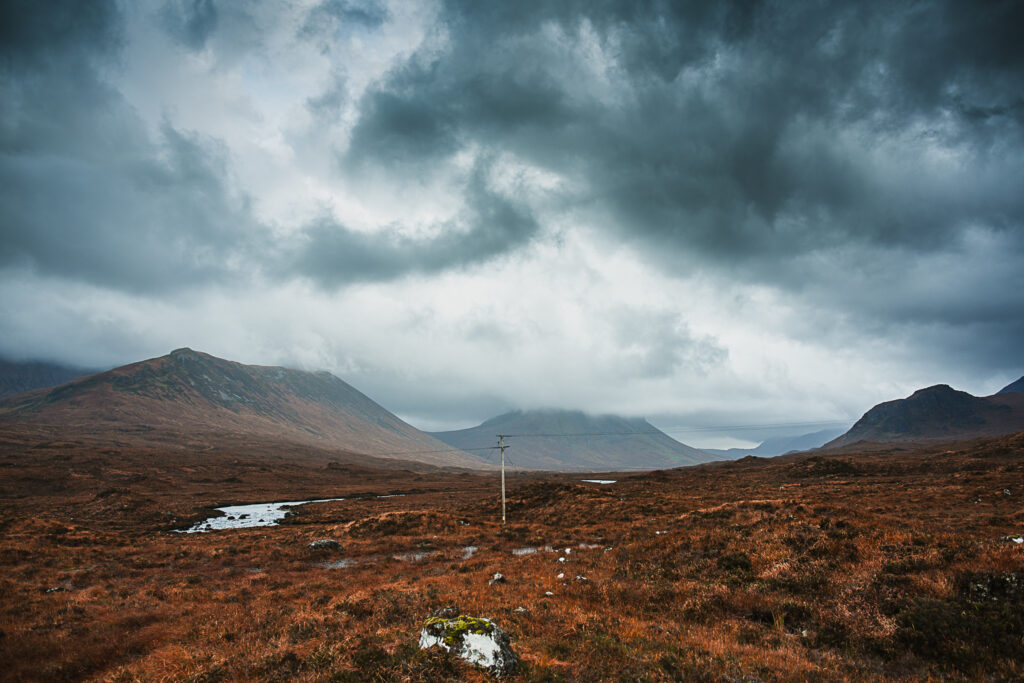 When I finally reached one of the waterfalls I had hoped to photograph, I was met with both awe and disappointment. Thick, low clouds shrouded the Bidean Druim nan Ramh mountains, hiding their peaks. Only the base of Bruach na Frìthe was visible. The wind howled in powerful gusts, so strong at times that it nearly knocked me over.