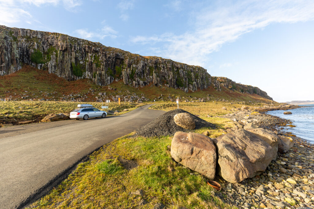 I drove down to Staffin Beach, but when I arrived, the light was quite harsh — the sun was already high, casting strong shadows and washing out the colours. Not ideal for the kind of moody landscape I was after. Since I wanted to make it to Neist Point before sunset and wasn’t sure how long the drive would take, I decided not to waste time setting up the tripod. I snapped a few quick handheld shots, enjoyed the crisp sea breeze for a moment, and jumped back in the car. Days are short in October — no time to waste. Onward to Neist Point.