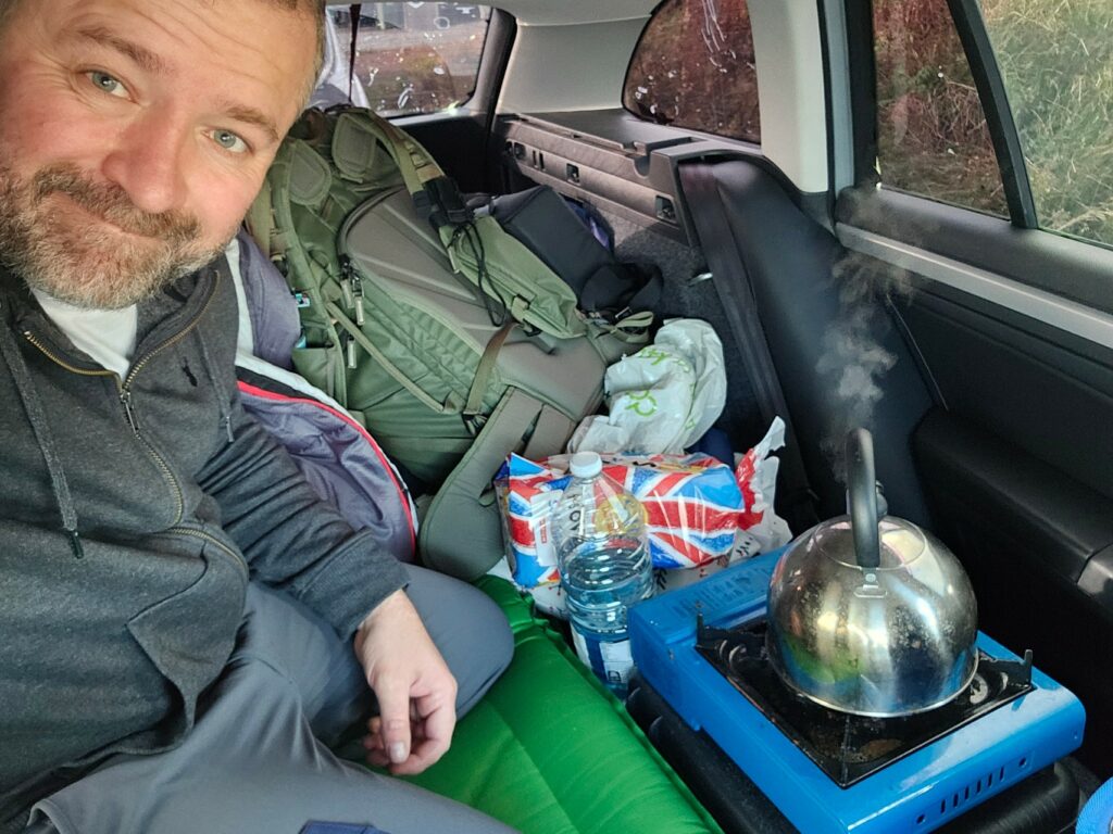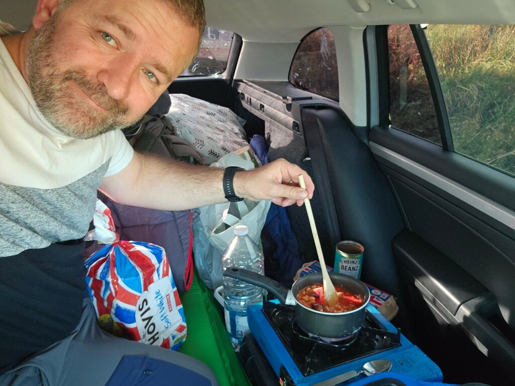 I rolled in, parked up, and breathed a proper sigh of relief. Time for a well-earned evening routine: heat up a simple meal in my little car-kitchen, throw on a film, and get cosy in the sleeping bag. The rain tapped on the roof, the car rocked gently in the wind, and honestly? It felt like a tiny, improvised motorhome — rough around the edges, but absolutely mine.
