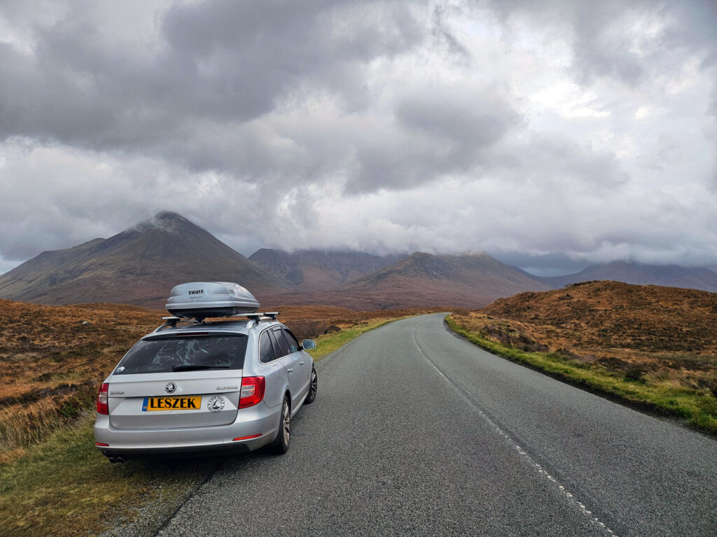 After wrapping up my windswept adventure at Neist Point, I pointed the Skoda toward the Fairy Pools — wanting to be already in the area and ready for an early start the next morning. By the time I hit the road, dusk had already settled in, and driving those narrow, pothole-riddled lanes in the dark was… well, let’s call it a character-building exercise. Every few metres I was dodging craters like I was in some off-road rally I never signed up for.