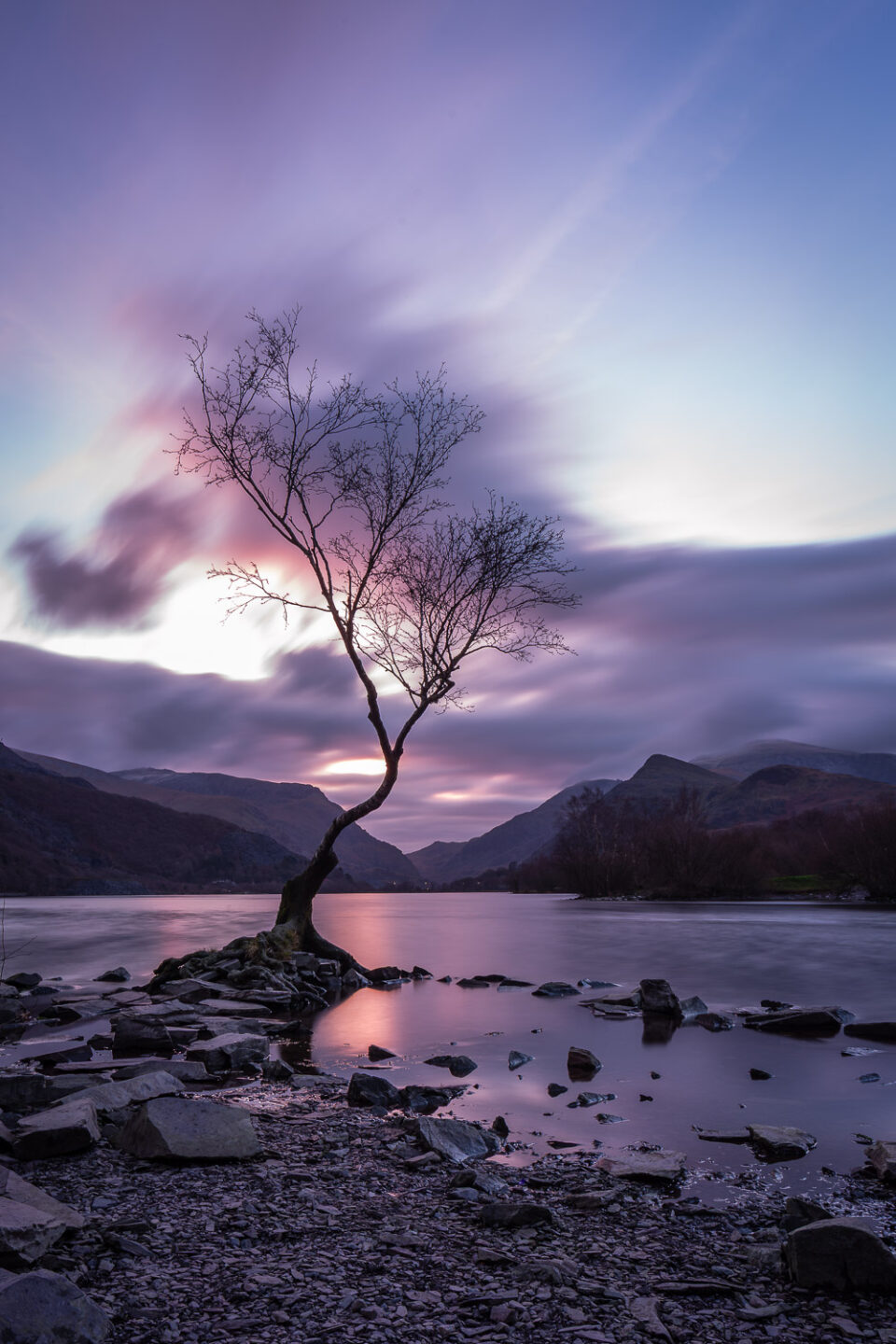 Witness the energetic arrival of a new day in Snowdonia. This print captures the dynamic atmosphere of sunrise at Llyn Padarn, where the moving clouds streak across the sky, driven by the morning breeze. The cool violets of the departing night clash dramatically with the vibrant pinks of the rising sun, creating a powerful scene of motion and light behind the stoic silhouette of the Lone Tree.