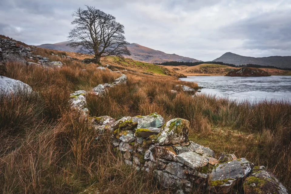 A timeless Snowdonia landscape captured at Llyn y Dywarchen, where traditional dry stone walls carve gentle lines through winter grasses and lead towards the distant Welsh mountains.